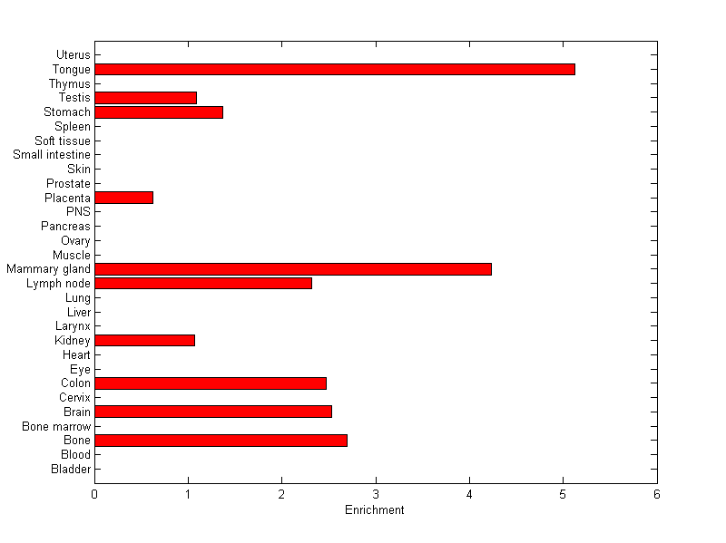 The expression level is normalized with tissue-library size. Each value for a gene in a tissue is a ratio of observed ESTs to the expected one in this tissue. The expected number of ESTs is the product of total ESTs of the gene and the fraction of total ESTs in the tissue among all ESTs in 30 tissues.