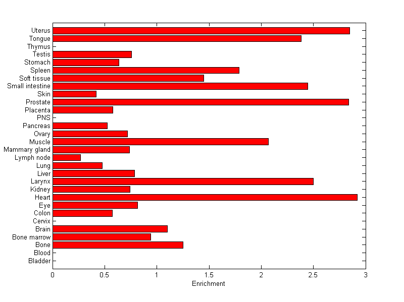 The expression level is normalized with tissue-library size. Each value for a gene in a tissue is a ratio of observed ESTs to the expected one in this tissue. The expected number of ESTs is the product of total ESTs of the gene and the fraction of total ESTs in the tissue among all ESTs in 30 tissues.
