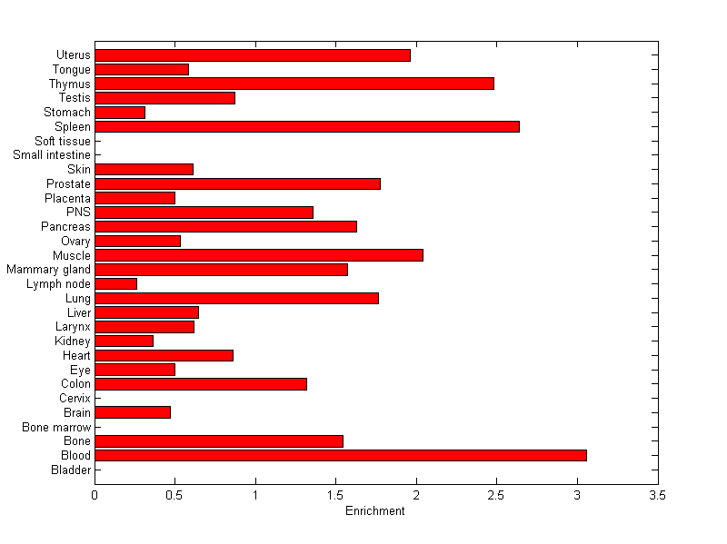 The expression level is normalized with tissue-library size. Each value for a gene in a tissue is a ratio of observed ESTs to the expected one in this tissue. The expected number of ESTs is the product of total ESTs of the gene and the fraction of total ESTs in the tissue among all ESTs in 30 tissues.