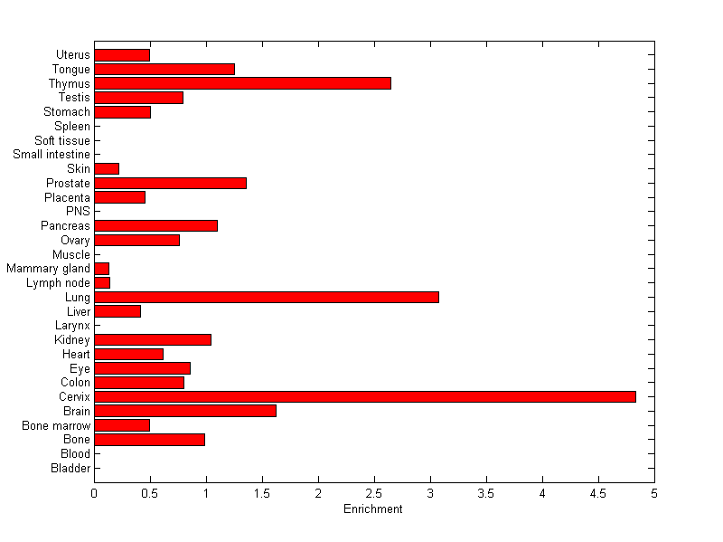 The expression level is normalized with tissue-library size. Each value for a gene in a tissue is a ratio of observed ESTs to the expected one in this tissue. The expected number of ESTs is the product of total ESTs of the gene and the fraction of total ESTs in the tissue among all ESTs in 30 tissues.
