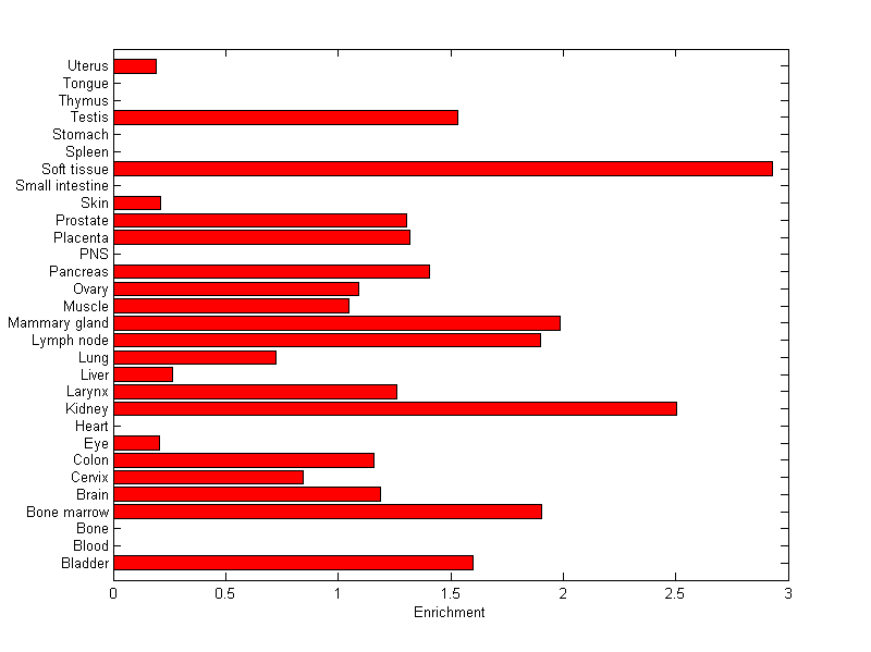 The expression level is normalized with tissue-library size. Each value for a gene in a tissue is a ratio of observed ESTs to the expected one in this tissue. The expected number of ESTs is the product of total ESTs of the gene and the fraction of total ESTs in the tissue among all ESTs in 30 tissues.