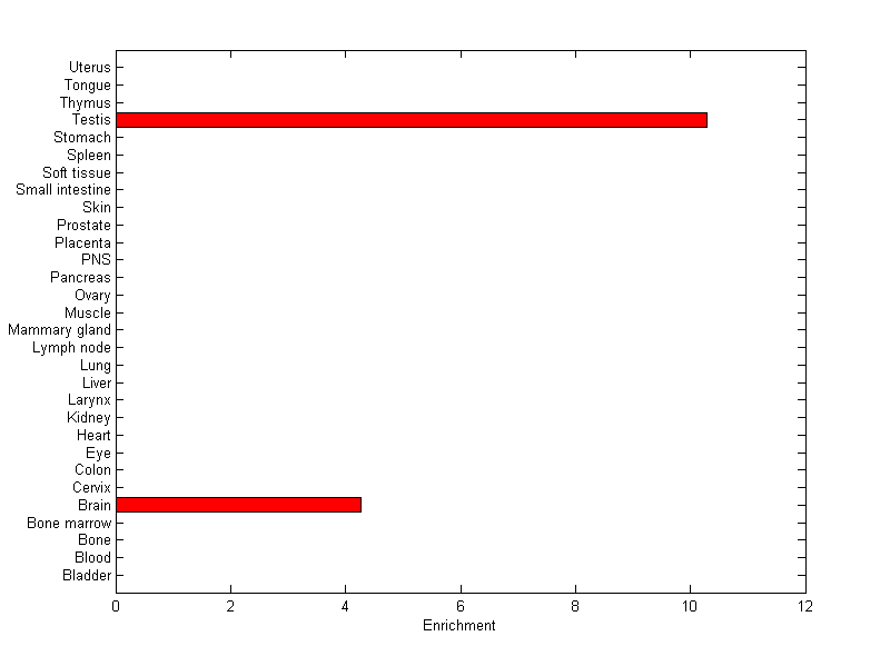 The expression level is normalized with tissue-library size. Each value for a gene in a tissue is a ratio of observed ESTs to the expected one in this tissue. The expected number of ESTs is the product of total ESTs of the gene and the fraction of total ESTs in the tissue among all ESTs in 30 tissues.