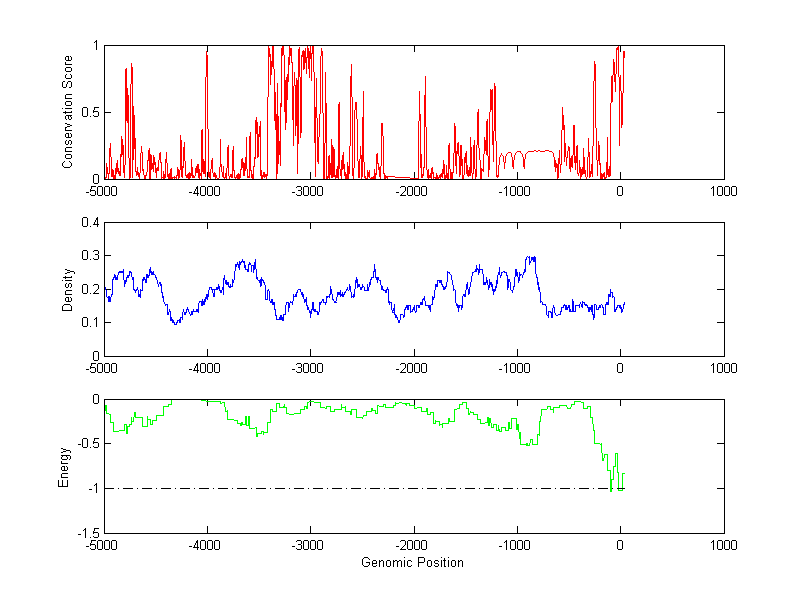The energy profile (green curve) is about energy for module detection based on TF interaction. The positions with energy less than -1 indicate the existence of CRMs.