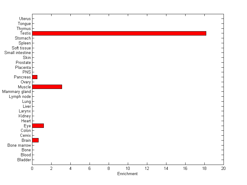 The expression level is normalized with tissue-library size. Each value for a gene in a tissue is a ratio of observed ESTs to the expected one in this tissue. The expected number of ESTs is the product of total ESTs of the gene and the fraction of total ESTs in the tissue among all ESTs in 30 tissues.