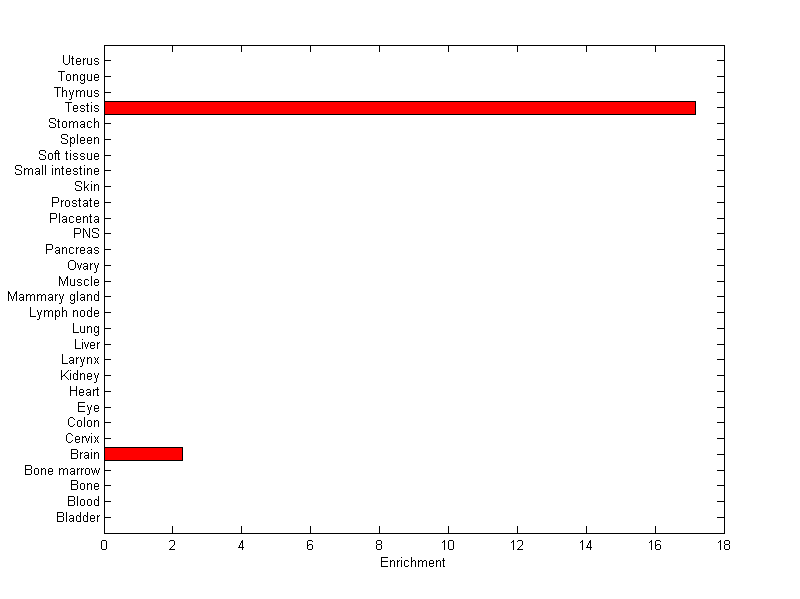 The expression level is normalized with tissue-library size. Each value for a gene in a tissue is a ratio of observed ESTs to the expected one in this tissue. The expected number of ESTs is the product of total ESTs of the gene and the fraction of total ESTs in the tissue among all ESTs in 30 tissues.