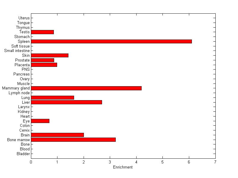 The expression level is normalized with tissue-library size. Each value for a gene in a tissue is a ratio of observed ESTs to the expected one in this tissue. The expected number of ESTs is the product of total ESTs of the gene and the fraction of total ESTs in the tissue among all ESTs in 30 tissues.