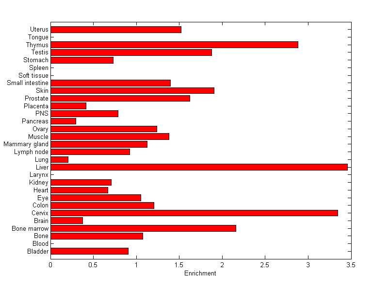 The expression level is normalized with tissue-library size. Each value for a gene in a tissue is a ratio of observed ESTs to the expected one in this tissue. The expected number of ESTs is the product of total ESTs of the gene and the fraction of total ESTs in the tissue among all ESTs in 30 tissues.