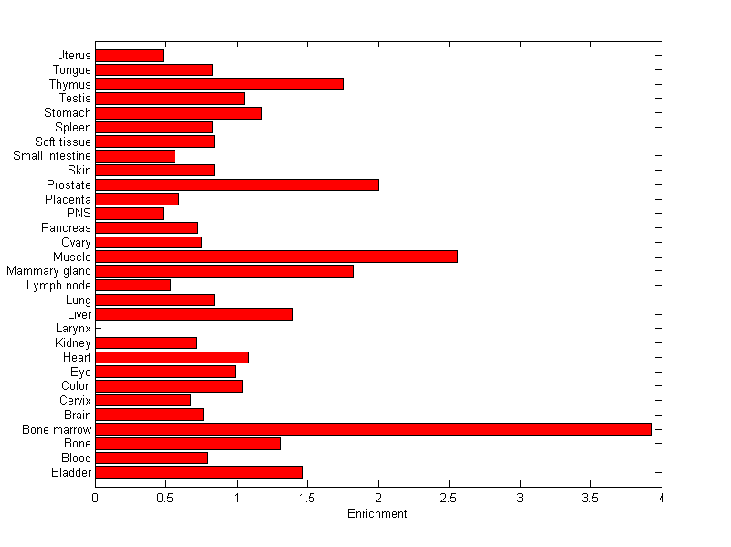 The expression level is normalized with tissue-library size. Each value for a gene in a tissue is a ratio of observed ESTs to the expected one in this tissue. The expected number of ESTs is the product of total ESTs of the gene and the fraction of total ESTs in the tissue among all ESTs in 30 tissues.