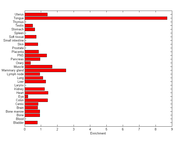 The expression level is normalized with tissue-library size. Each value for a gene in a tissue is a ratio of observed ESTs to the expected one in this tissue. The expected number of ESTs is the product of total ESTs of the gene and the fraction of total ESTs in the tissue among all ESTs in 30 tissues.